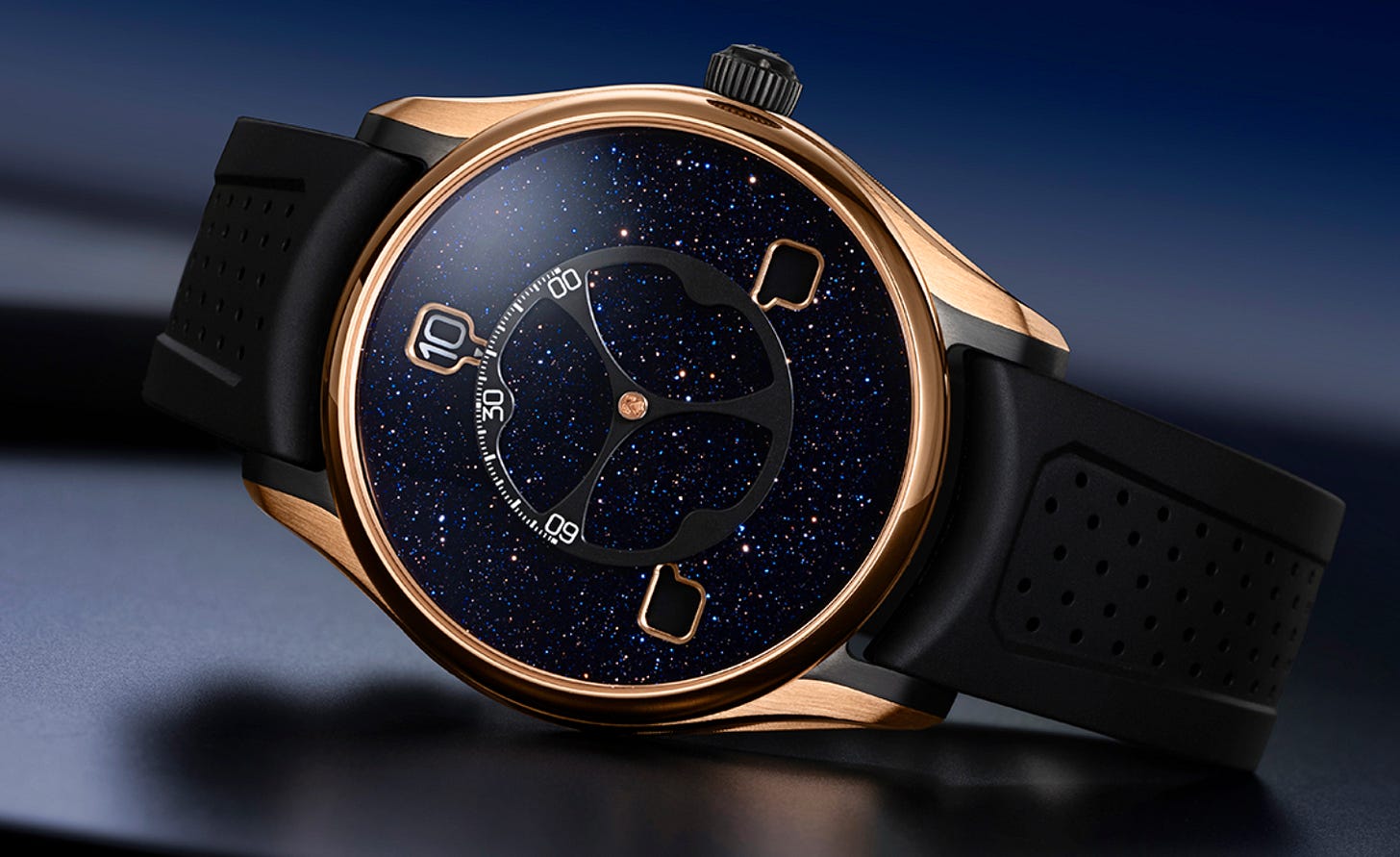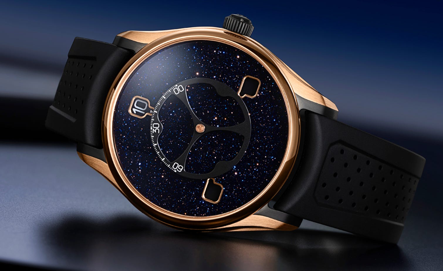 Earlier this year, H. Moser & Cie. launched two Pioneer Flying Hours models, one with an aventurine dial and another with a white fumé dial. Their execution of the wandering hours complication is irresistible.